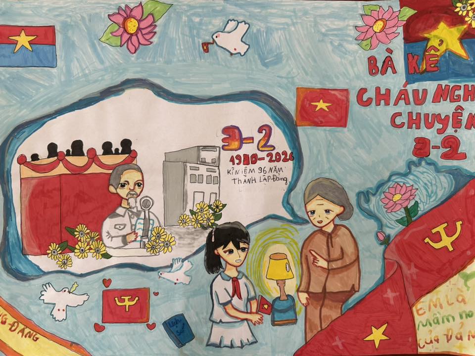 Những nét vẽ hồn nhiên, trong sáng của các em học sinh đã thể hiện tình cảm kính yêu, niềm tự hào và lòng biết ơn đối với Đảng Cộng sản Việt Nam. Hoạt động ý nghĩa này được tổ chức nhân kỷ niệm 96 năm Ngày thành lập Đảng Cộng sản Việt Nam (3/2/1930 – 3/2/2026) và chào mừng thành công Đại hội đại biểu toàn quốc lần thứ XIV của Đảng, nhiệm kỳ 2026–2031.